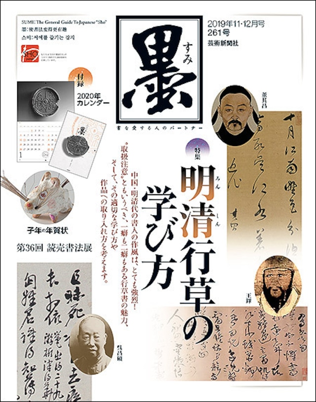 【特集】 今回は中国書道史の中でも あらゆる書風が登場し、個性際立つ、 明と清の行草作品をご紹介します。 一癖も二癖もある書は 学び方によってはとびきりのスパイスになり、 みなさんの作品に、より豊かな味わいと 香りをもたらしてくれるはずです。 まだ出会ったことのない スパイスを探しに行ってみましょう! ・鑑賞1 明清行草を味わう 選・解説/髙木聖雨 人物略歴・釈文 人物略歴執筆/青木聴雪 ・一覧 明清行草 人物相関 ・鑑賞2 現代書家 書き下ろし 臨書作品 図解 超絶テクニック 明石聴濤・今川鴎洞・川嶋毛古・中村雲龍 ・ビギナー 明清行草 手習いはじめ 講師/西 墨濤 ・クローズアップ 翰墨の縁 一挙公開! 包世臣「臨書譜」と呉譲之跋 ・Q&Aレッスン 明清行草を参考に 引き出しのふやし方 講師/松村博峰 ・コラム 文房四宝から明清の書を見る 文/青木聴雪 【企画】 ・子年の年賀状 子年生まれの書家の年賀状 岩村節盧・薄田東仙・岡野楠亭・表 義章・ 風岡五城・川口青澄・小杉修史・佐川雲窓・ 清水透石・小 朴圃・中塚博子・中西浩暘・ 楢崎華祥・日比野 実・平樂大龕・前 遊舟・ 増子哲舟・皆川恭舟・渡邉 麗 もぐら庵 子の歳参上 もぐら庵の干支戯陶 新年への思いを表す年賀状 子年編 講師/田中豪元 写真で作る新年のカレンダー 作品制作/田中豪元 「子」の年は「一陽来復」 文・画/山口謠司 子・鼠の集字帖 【連載】 ・季を告げる花々 冬菊 ・今日も書室で 陳曼生製紫砂壷 ・書語辞典 文/伊藤文生 ・『墨海』抄 訳・注/井垣清明・塩谷章子 ・これでスッキリ! 書道なんでも相談所 文/堀 久夫 ・書論通観 岡倉天心「『書は美術ならず』の論を読む」 文/松村茂樹 ・翰墨の縁 葉為銘・童大年 ・碑法帖存疑 翁同ワ旧蔵「唐刻宋拓晋唐小楷八種」考 文/伊藤 滋 ・韓国書芸通信 文/金周會 ・中国当代書家二十人 鍾明善 監修/蘇士? 取材・文/郭同慶 ・ギャラリー 甘泉宮瓦当 ・風につたへし 文/木下真理子 ・戦後生まれの「書」の行方 取材・文/武田 厚 ・墨蹟巡礼 印可状 文/財前 謙 ・リレー講座 書の線で描ける水墨画 講師/岡田 潤 【トピックス】 ・特別寄稿 書の旅 北京・琉璃廠編 文/高澤浩一 ・墨手箱 特別編 この人と書と 萩原朔太郎 文/沢村澄子 ・寄稿 精神のたまり場 俳人・永田耕衣の短冊 文/小川貴史 「令和」と「離騒」と桑原翠邦 文/佐藤容齋 ・レポート 継続困難な競書誌 引き受けます! “競書誌請負人”リンクスグループ 東京中央オークションがロゴを刷新! 秋季オークションも活況! 日中韓 書教育のゆくえ 文/草津祐介 展覧会ピックアップ ・インフォメーション 五島美術館 特別展 美意識のトランジション 予告 『墨』特製「書道手帳」 『墨』年間購読料の変更のお知らせ 『墨』創刊40周年記念企画『墨の特集』縮刷版 ・墨手箱 書字庭園抄 デザイン“すみずみ”異聞録 文/深沢慶太 蘭子の書道日記 ・読者参加企画 臨書作品募集 審査/西 墨濤 260号作品募集結果発表 審査/小原城道 【展覧会】 ・プレビュー 第19回 扶桑印社展 日々──製硯師 青栁貴史の硯展 ・話題の展覧会 前衛作家 関口虚想遺墨展 鈴木一敬書展書──その愛 第36回 読売書法展 第75回 福岡県美術展覧会 2019 ・話題の書道展より 第59回 現日書展 第59回 白扇書道会展 第63回 凌雲書展 第36回 全国公募 日本綜合書作院展 寒玉書道会 第15回選抜展 【墨らんだむ】 ・書道通信 ・エッセイ 伝えたい言葉 ・読者の広場 ・新刊ぴっくあっぷ ・展覧会ルポ ・展覧会アラカルト ・11・12月の展覧会スケジュール ・愛読者プレゼント ・バックナンバー一覧 ・常設書店リスト ・次号予告・編集後記