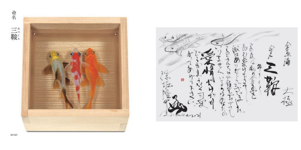 透明樹脂にアクリル絵具で金魚を描くという独自の手法で、まるで生きているかのような立体的な金魚を枡の中に閉じ込めました。彼の代表作であるこの「金魚酒」20周年を記念した集大成本の箱入り、金箔小口塗装の特装版。20年分の全作品を掲載し、初期の作品から現在までの技術の移り変わりが歴史を感じさせ、本物以上に“リアル”な金魚に驚かされます。