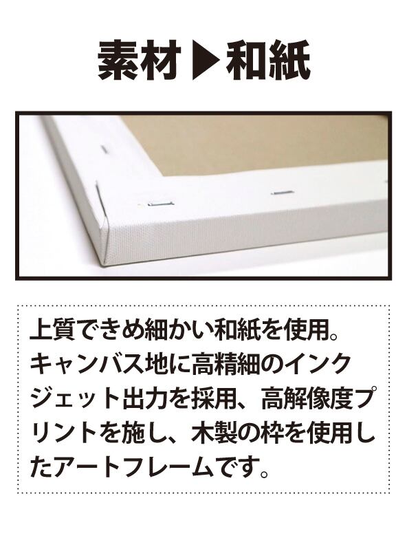 上質できめ細かい和紙にインクジェットプリンターで印刷を行い、高級感のある木製の枠を使用。 ハイクオリティな複製原画。