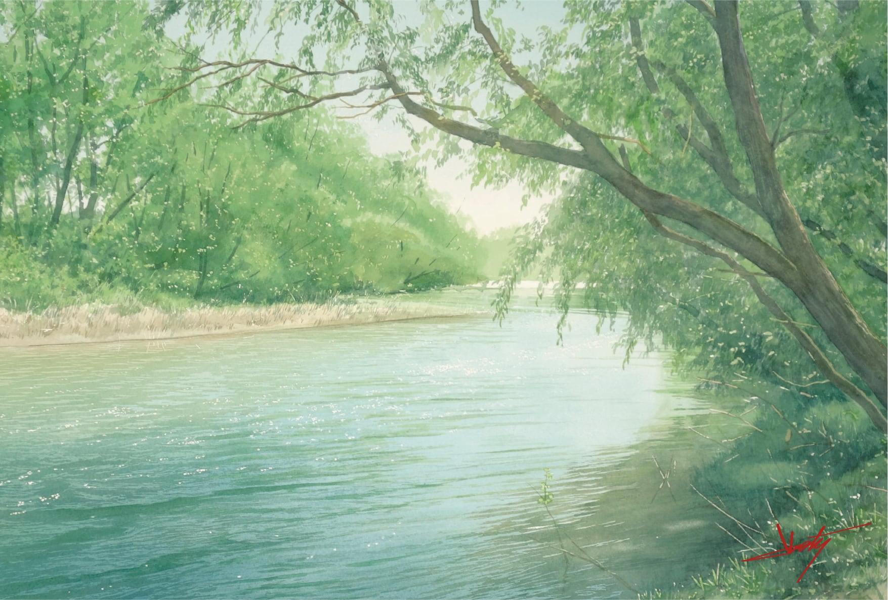 『あべとしゆき水彩画集』A3サイズ 和紙キャンバス「新緑の水辺」